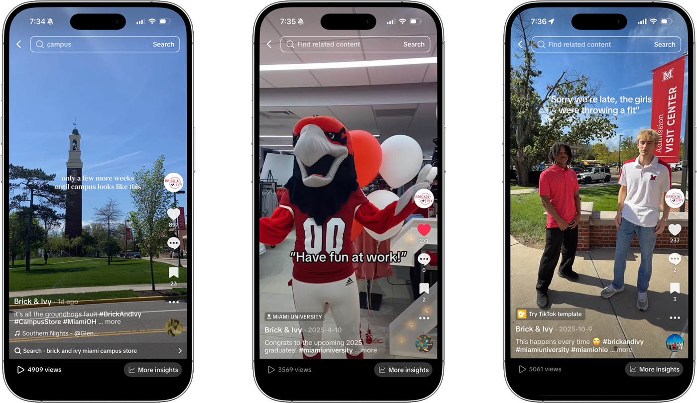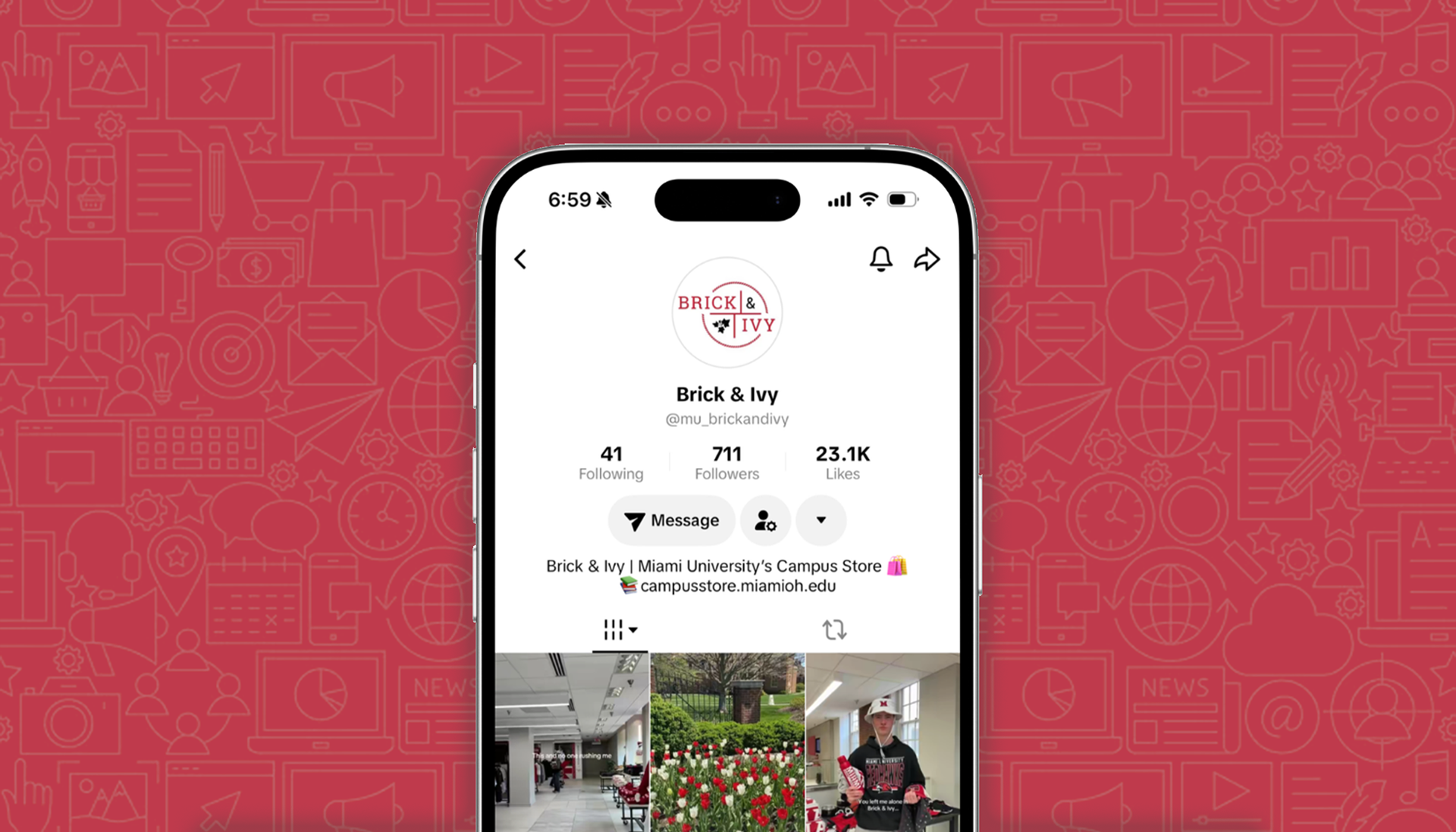 Brick & Ivy is Miami University's official campus lifestyle store — a brand built around school pride, quality apparel, and the culture that makes Miami feel like home. I joined the social media team as a content creator, responsible for growing the brand's digital presence and connecting with the student community online.