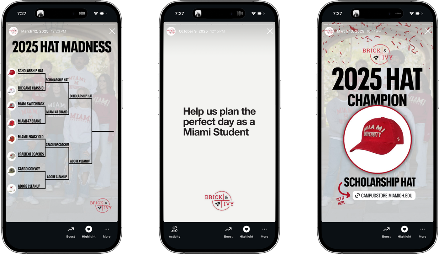 I focused on two things: consistency and authenticity. Every piece of content was designed to connect Brick & Ivy's products to real moments in student life — not just display them. I introduced interactive content formats to deepen audience engagement, including a March Madness-style hat bracket and a poll-driven "Help Us Plan the Perfect Day" Story series that let followers shape the narrative directly.